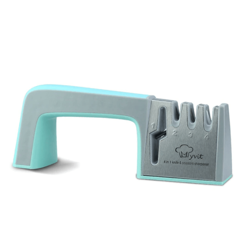 - Versatilidade: Quatro fendas para diferentes tipos de facas e até tesouras.