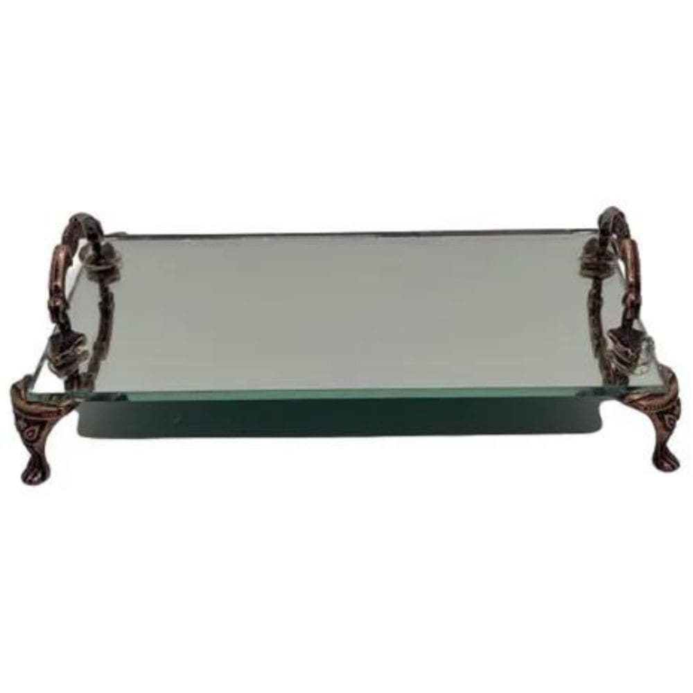 A Bandeja Decorativa Retangular Espelhada possui acabamento fino e embeleza o ambiente. Possui Detalhes de Pês e Alças na cor rosé.