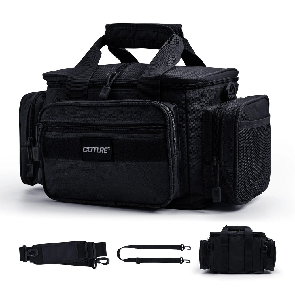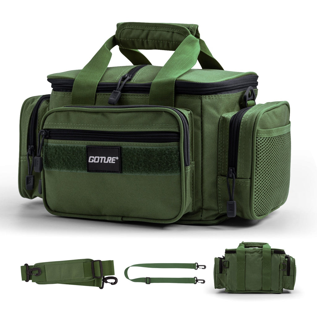 Bolsa de pesca multifuncional fabricada com materiais duráveis e costuras reforçadas, projetada para transportar equipamentos em diferentes condições ambientais. Conta com compartimentos internos amplos e divisórias organizadoras para armazenamento de iscas, anzóis, linhas, carretilhas e acessórios diversos.