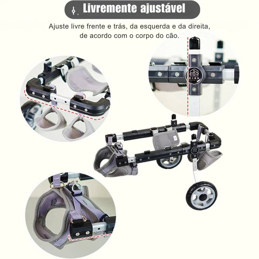 Imagine seu pet explorando o mundo à sua volta com alegria e conforto. A cadeira de rodas ajustável proporciona suporte e mobilidade, permitindo que cães e gatos vivenciem momentos de diversão e liberdade novamente.