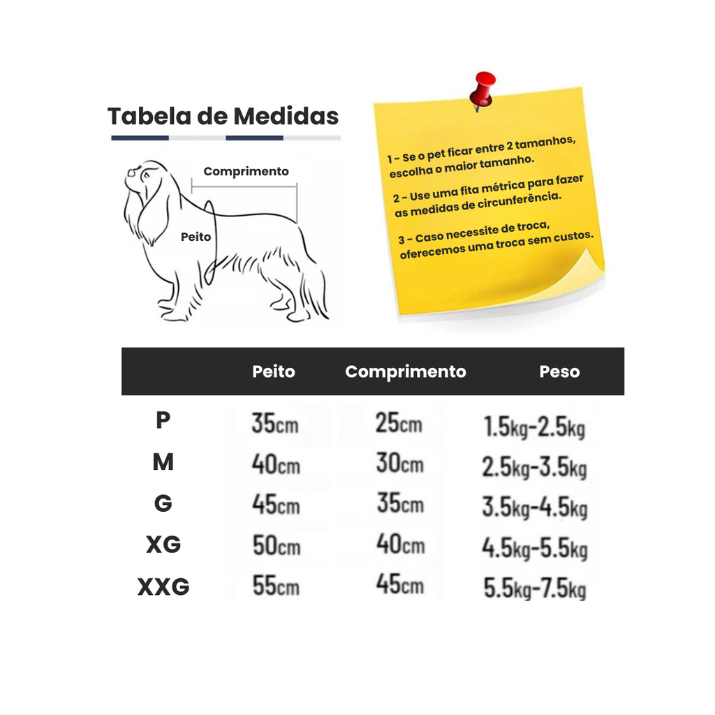 - Facilidade: Design prático que torna vestir seu pet um momento rápido e sem estresse.