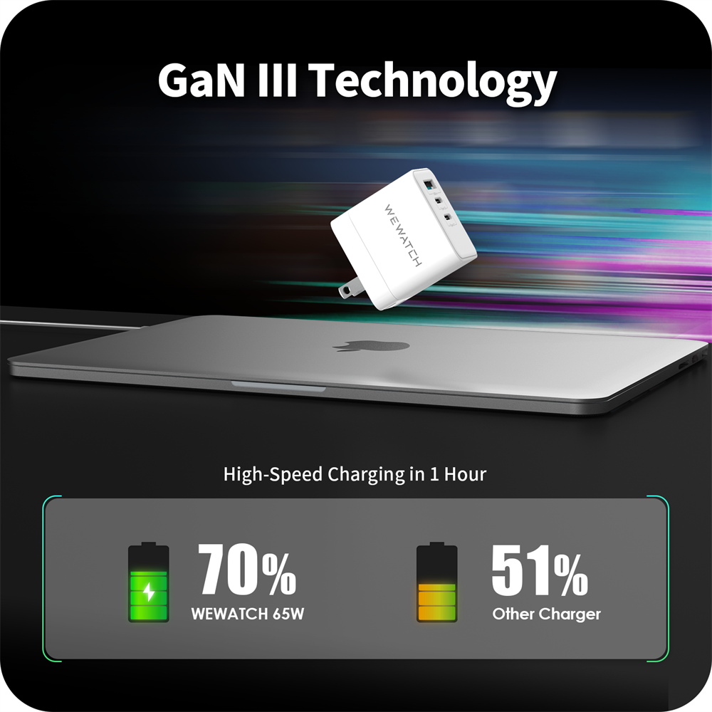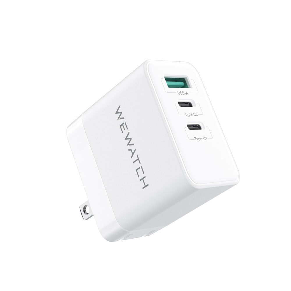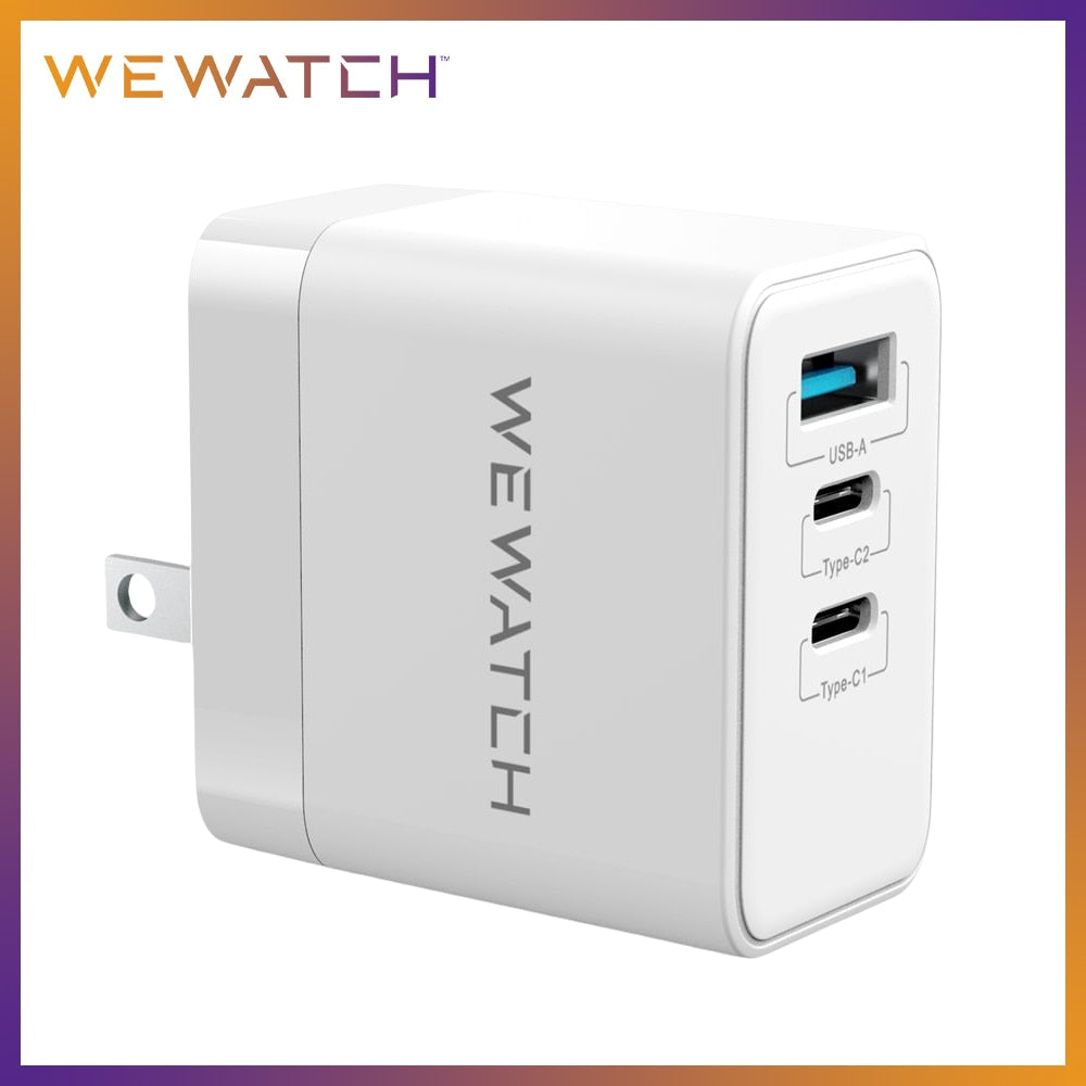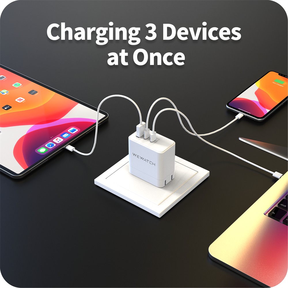 O carregador rápido da Wewatch é 40% menor do que outros carregadores com 3 portas no mercado, permitindo que ele seja armazenado facilmente em sua mochila para o trabalho, estudo ou viagem; os terminais dobráveis adicionam segurança para uso nas tomadas.