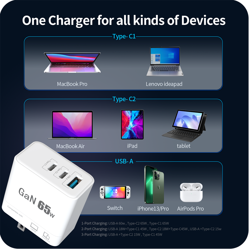 Certificações internacionais. Etl, fcc certificada; conforme certificação ul std 62368-1; o carregador portátil de 65w GaN é equipado com proteção para sobrecorrente, sobretensão, superaquecimento e curto-circuito para proteger seu dispositivo.