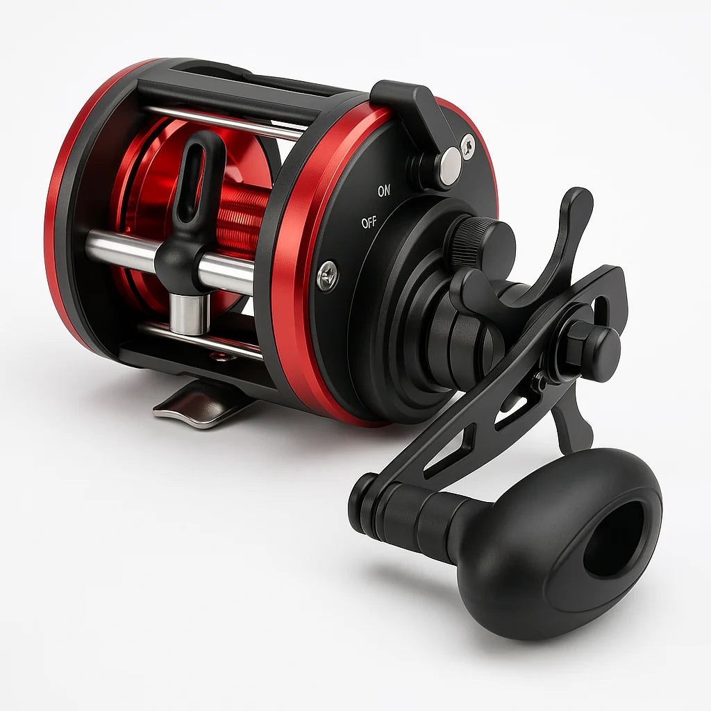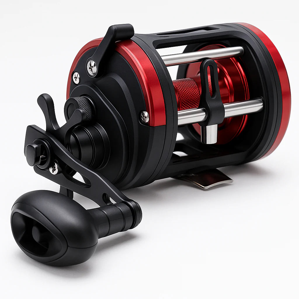 Carretilha perfil alto indicada para pescarias pesadas em água doce e salgada, com estrutura reforçada e capacidade de arrasto de até 25 kg, adequada para espécies de grande porte como dourado, trairão e tucunaré.