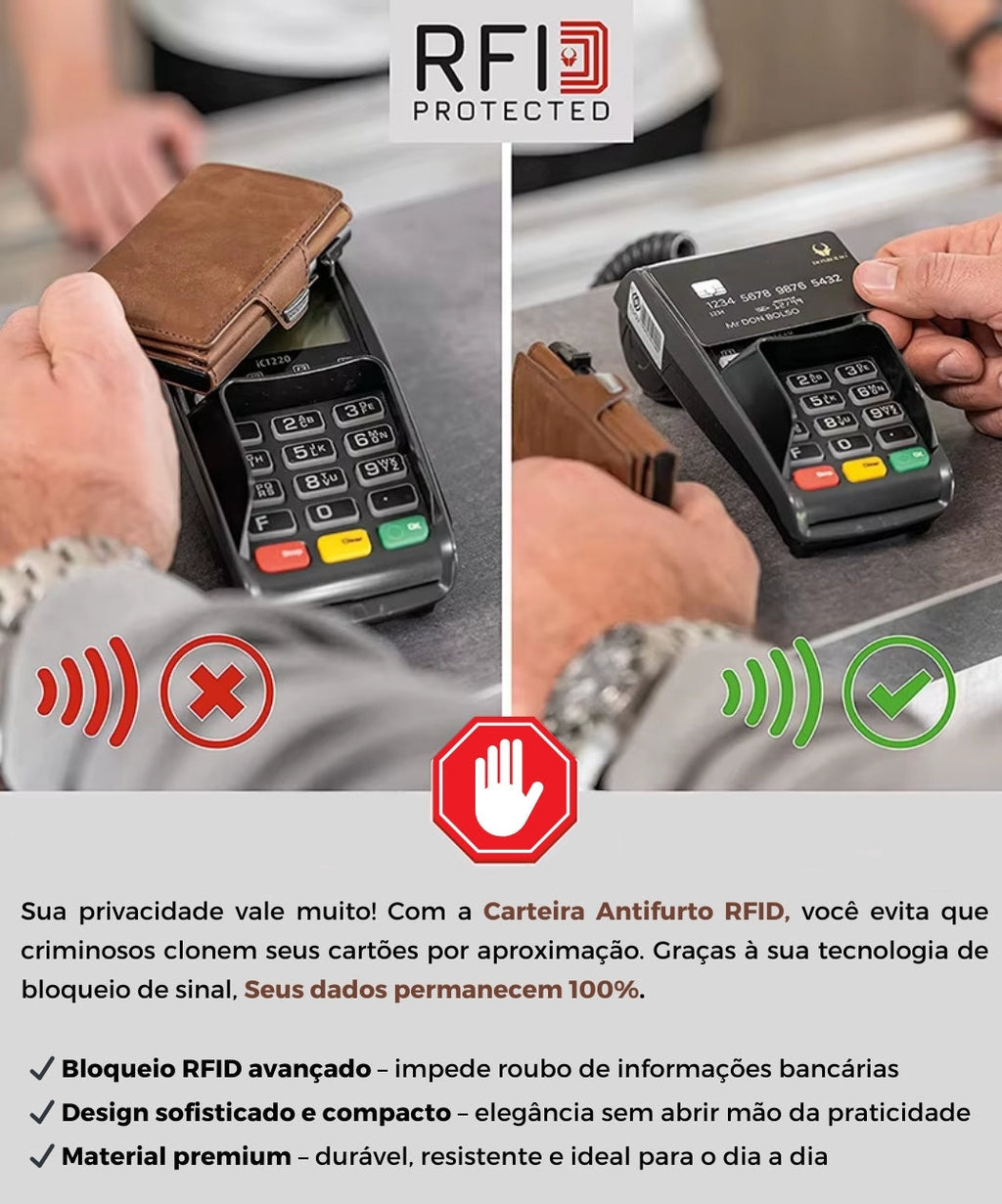 • Proteção RFID: Impede fraudes por aproximação e protege seus dados.