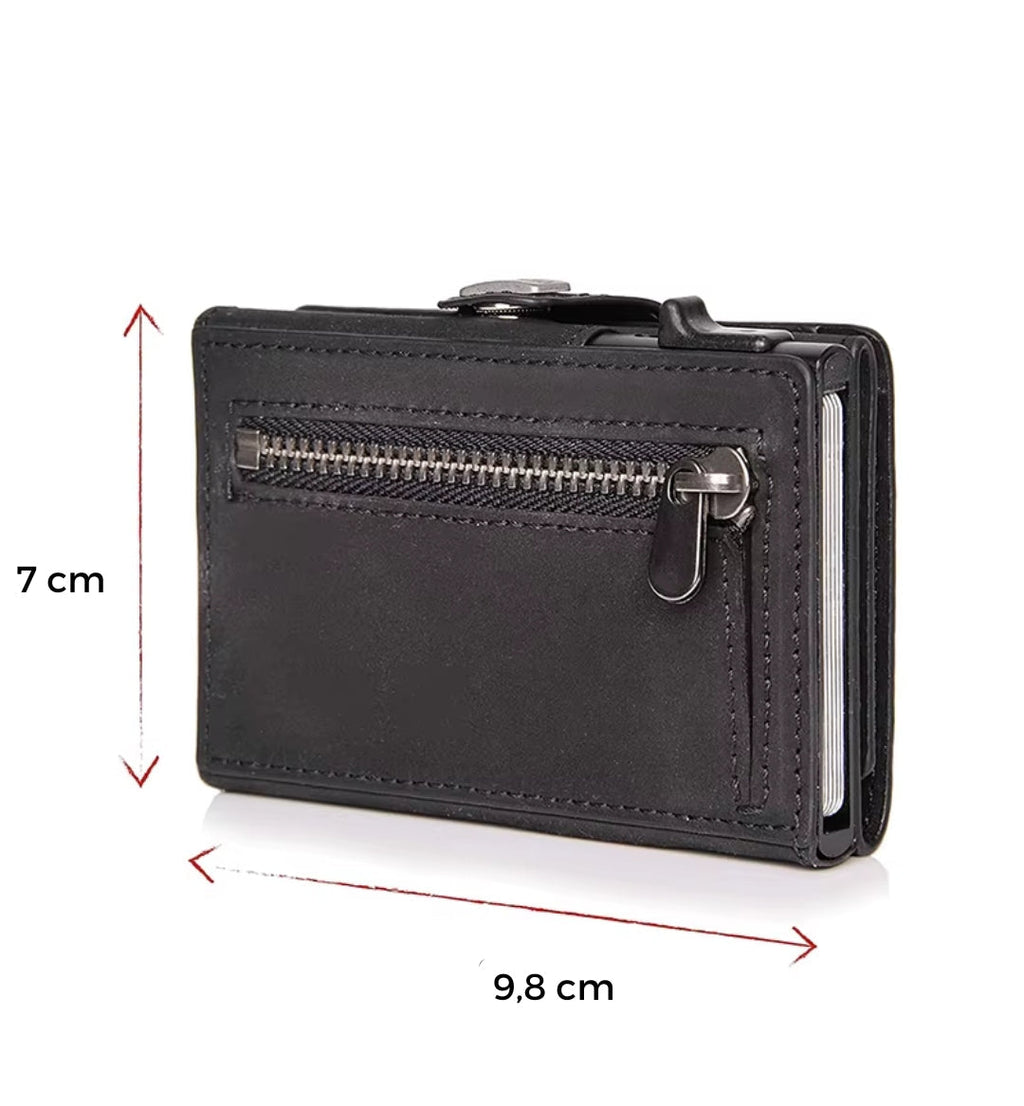 • Estojo de Alumínio: Garante a integridade dos seus cartões e prolonga a vida útil da carteira.