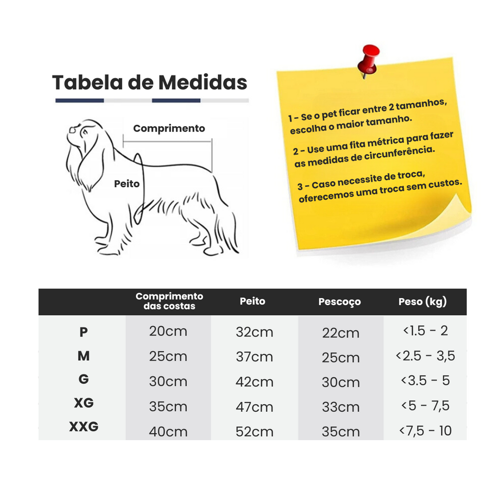 - Variedade de Tamanhos: Disponível em P, M, G e GG, atendendo a todos os portes.