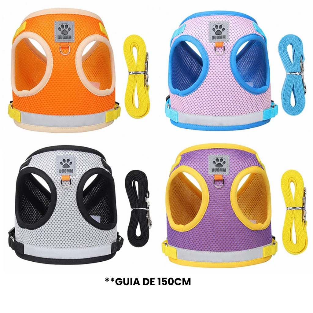 Imagine seu pet, feliz e seguro, explorando o mundo ao seu lado. Com o Conjunto de Peitoral e Guia Reflexivo, cada passeio se torna uma nova aventura, onde a segurança é prioridade e o conforto é garantido.