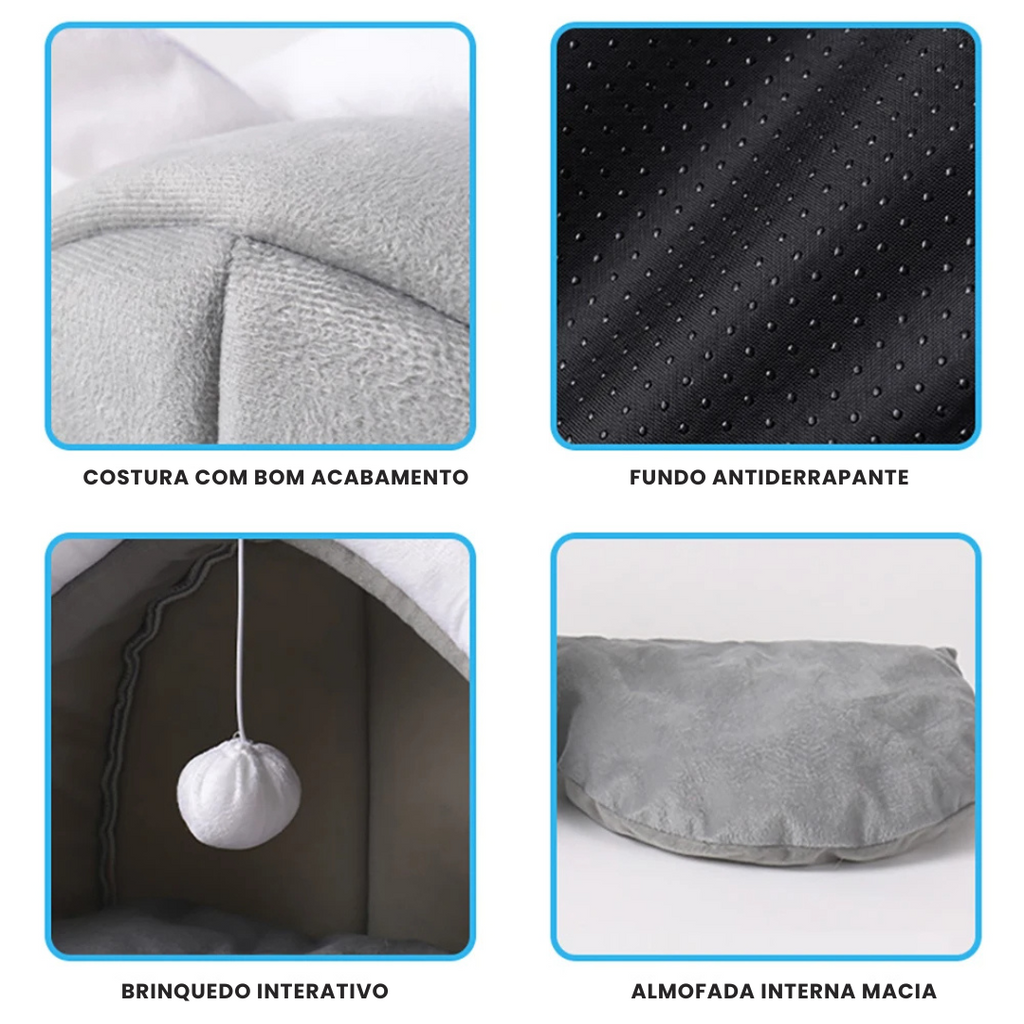 Imagine seu gato se encolhendo em um espaço macio e seguro, ouvindo o leve tilintar de um brinquedo pendurado. A Cama Toca oferece um cantinho acolhedor, onde ele pode relaxar e brincar ao mesmo tempo.