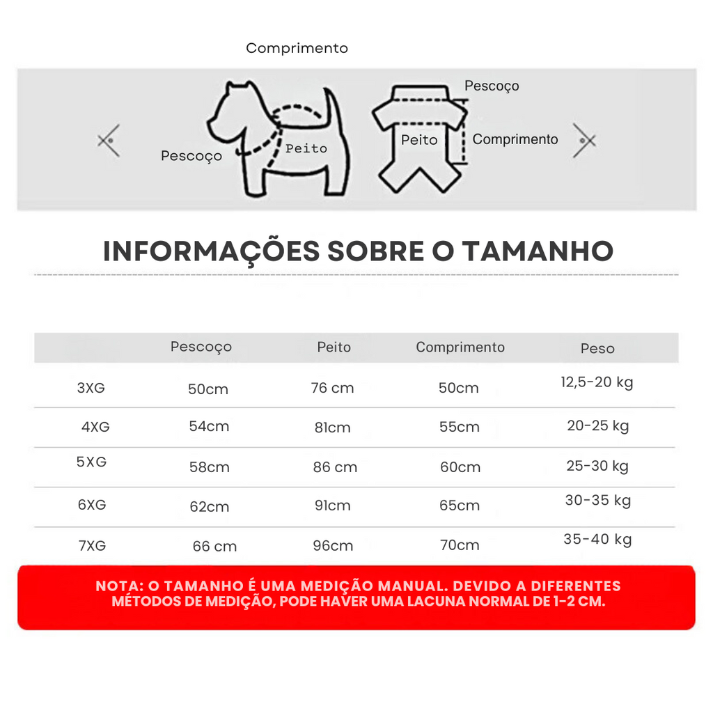 - Tamanhos: Disponível para cães de médio a grande porte (consulte a tabela de medidas).