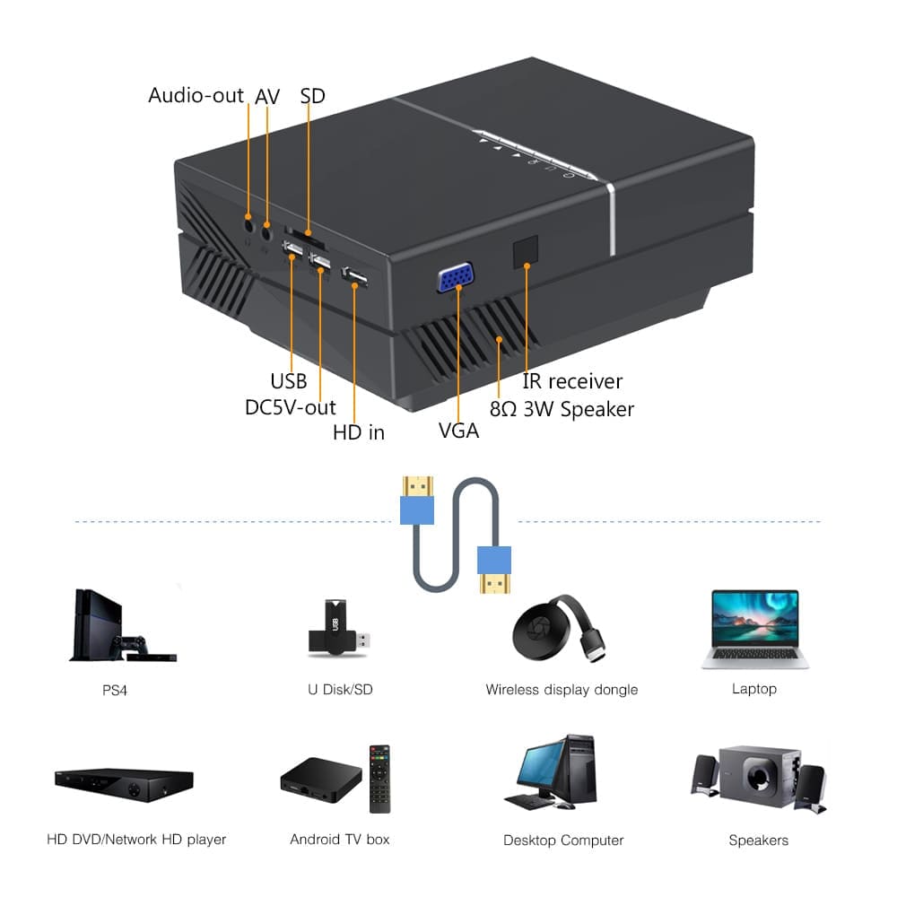 Interface completa com hd usb tf av vga, compatível com vários dispositivos