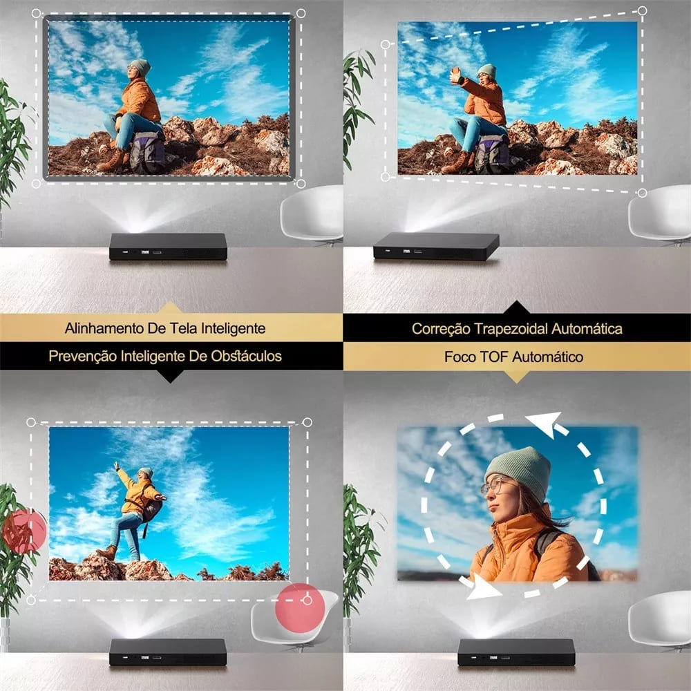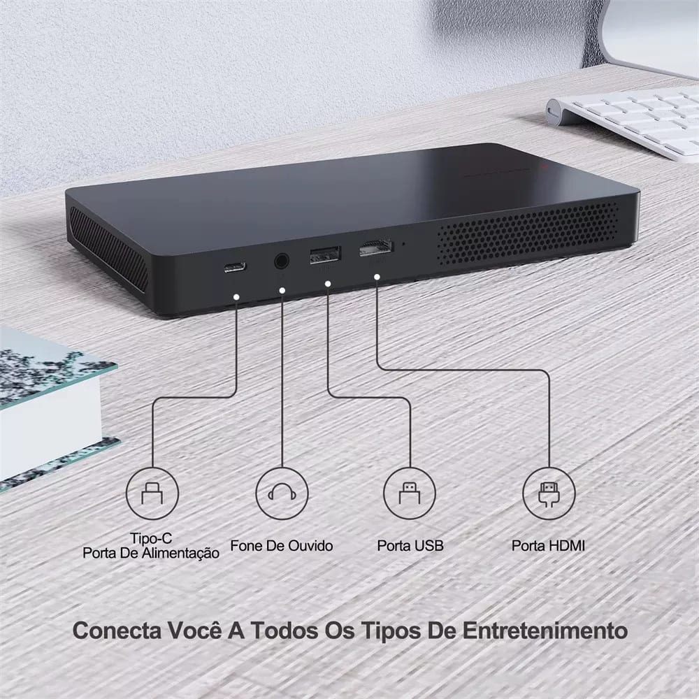 Este projetor portátil é carregado com recursos, incluindo um sistema operacional inteligente, WiFi, Bluetooth e uma bateria interna para até 6 horas de projeção.