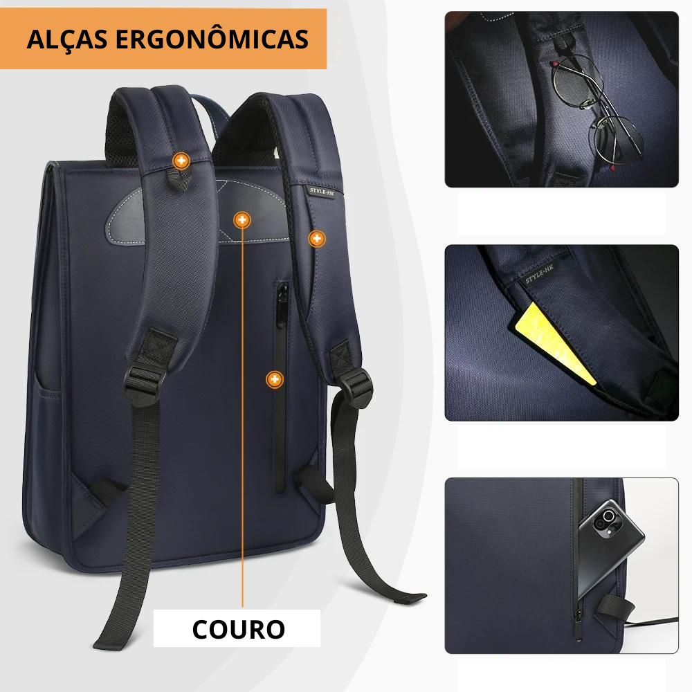 - Porta USB externa: Carregue seus dispositivos sem precisar tirar o cabo da mochila.