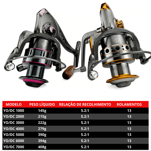 13 Rolamentos: Recolhimento suave e eficiente em todas as pescarias.