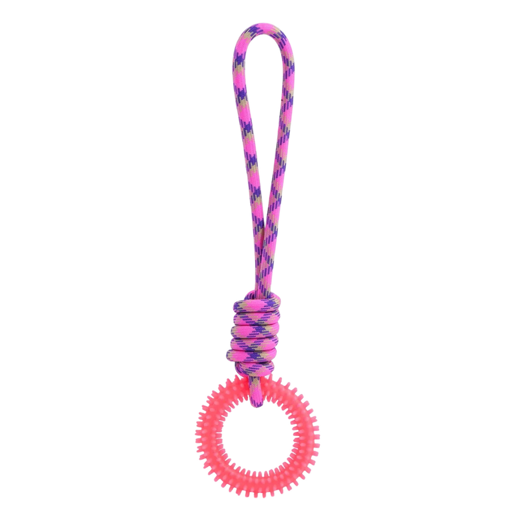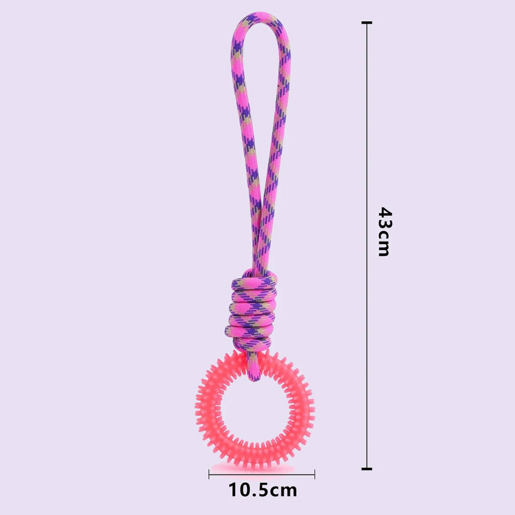Experimente a alegria do seu pet enquanto ele mastiga e brinca com o Brinquedo Interativo de Treinamento. Sinta a textura do anel cravado sob suas patas enquanto ele se diverte, promovendo a saúde dental ao mesmo tempo.
