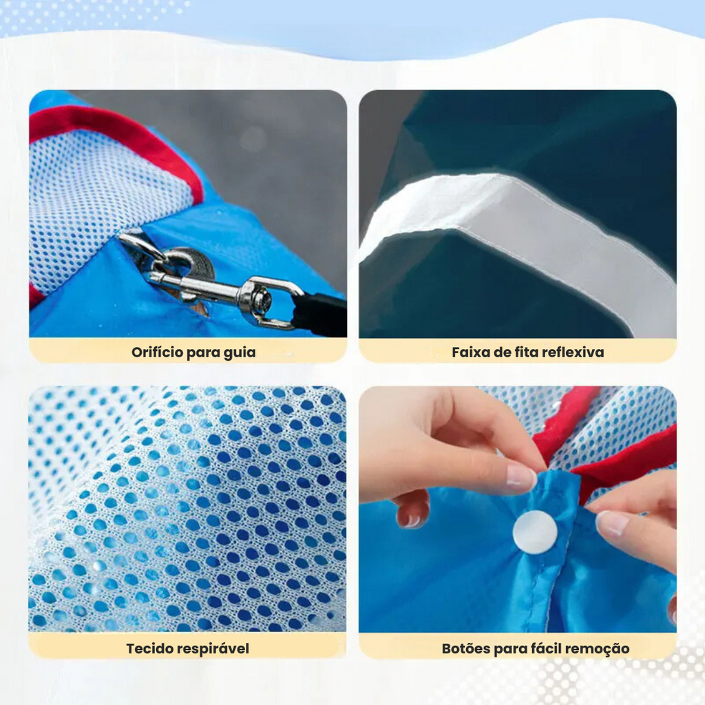 - Capuz Integrado: Proteção extra para a cabeça do seu cão.